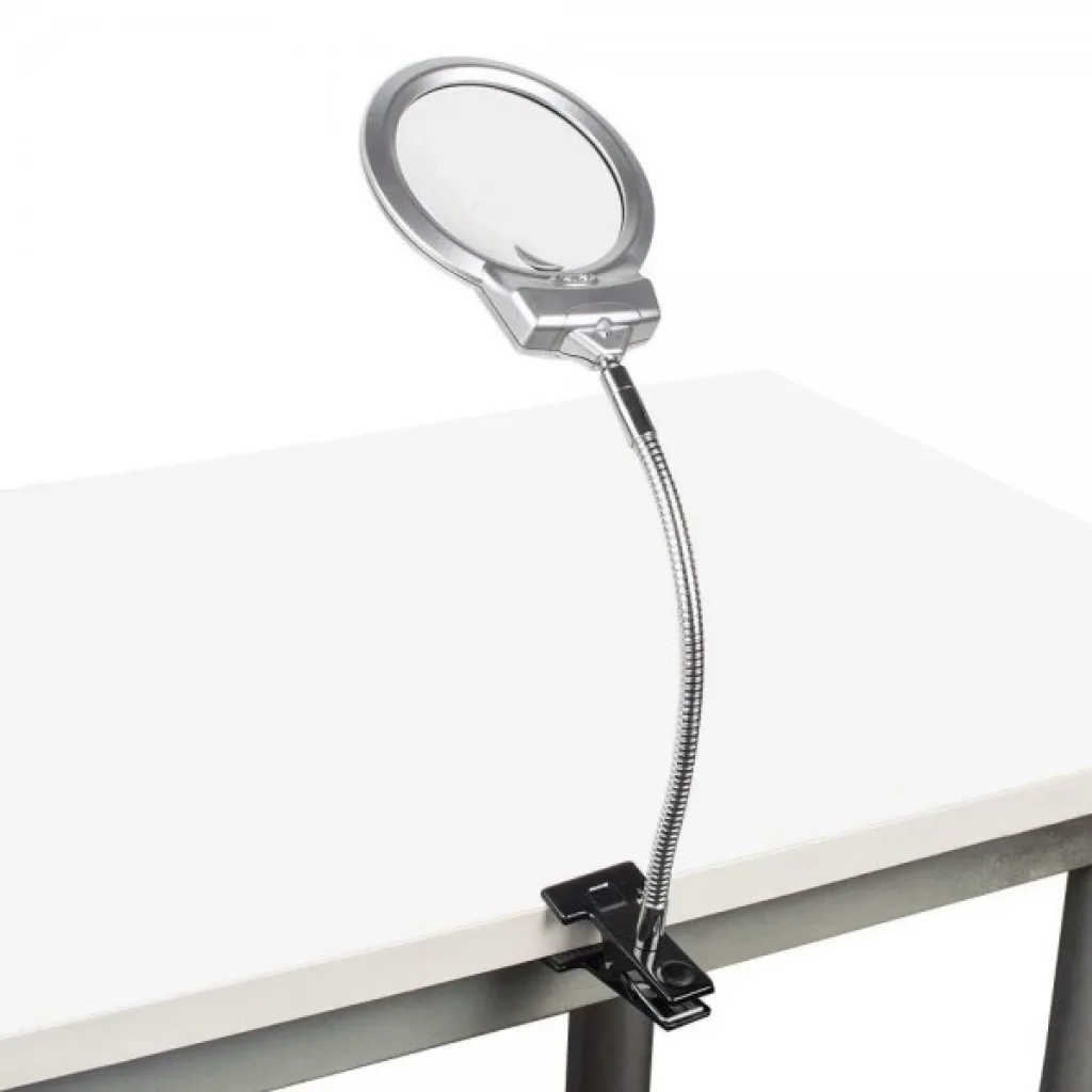 Mandallı LEDli Masa Üstü Profesyonel Büyüteç Üzerindeki ledler ile odak noktasını daha net gözükmesine yardımcı olur. Ledler için açmakapama butonu. Objeleri rahatlıkla görmenizi sağlar Flex Robot gövde yapısı sayesinde pratik bir şekilde kullanabilirsiniz. Büyük Büyüteç: 2x Küçük Büyüteç: 5x oranında objeleri büyük göstermektedir. Masaya çok sıkı bir şekilde tutunmaktadır. 2 Adet beyaz led bulunmaktadır. 3 AAA Kalem pil ile çalışmaktadır. (piller e dahil değildir.) Renk : Gri Ölçüler: Max. Uzunluk: 64 cm Kol Uzunluğu: 42 cm Büyüteç Çapı: 130 mm Küçük Büyüteç Çapı: 2.5 cm