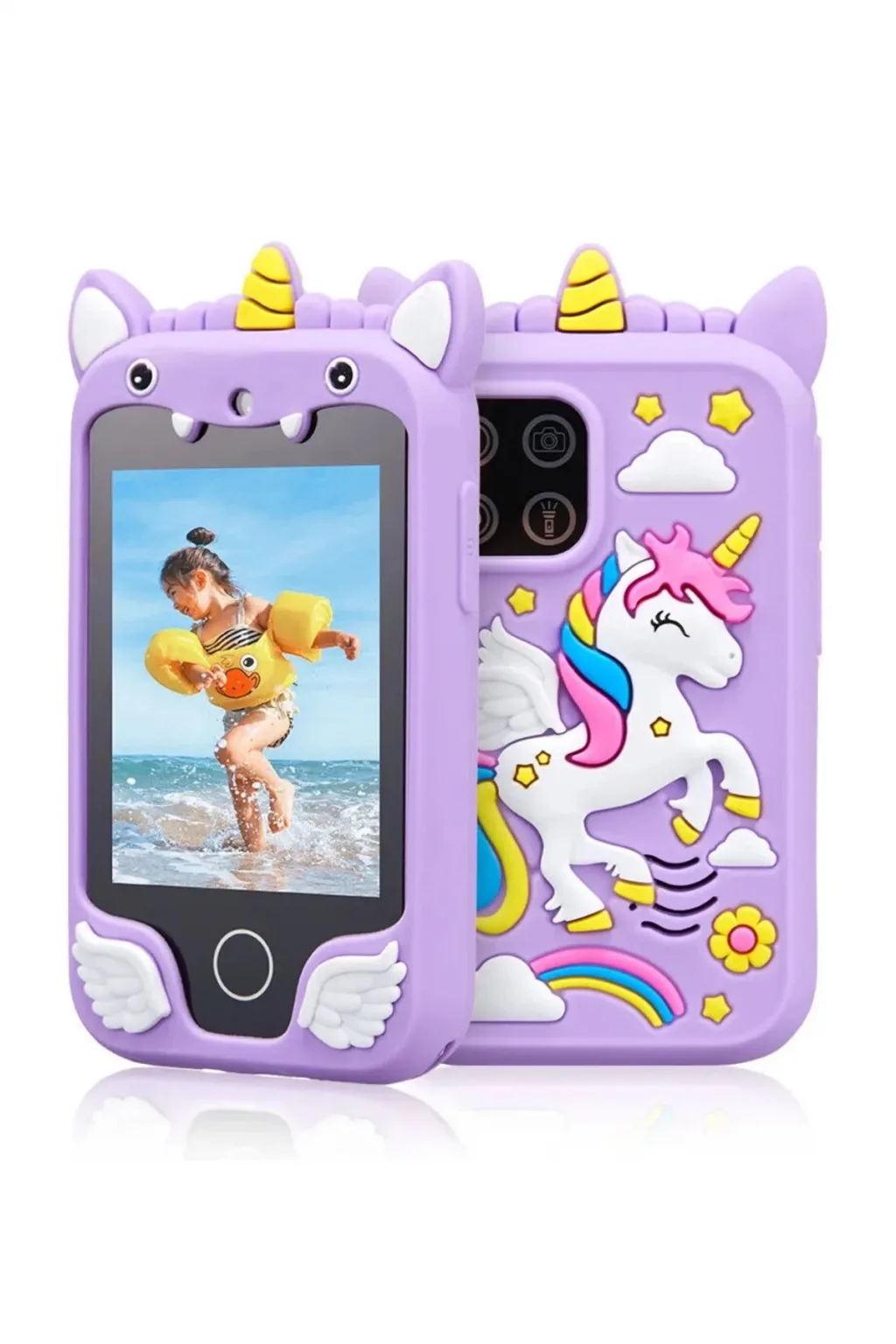 2.8 İnç Karikatür Hayvan Çift Lensli Dokunmatik Ekranlı Çocuk Kamerası Oyuncak Telefon Dahili Oyunlar - Pembe Tek Boynuzlu At