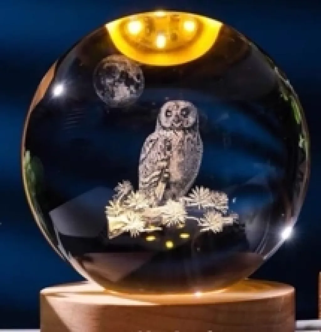 Dekoratif Baykuş Tasarımlı Ahşap Altlıklı Işıklı Cam Küre Büyük Boy 8cm