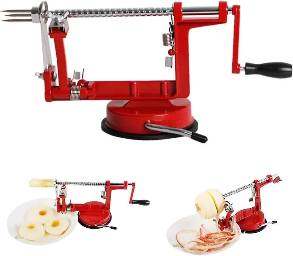 Elma yemek ve soymak hiç bu kadar zevkli olmamıştı Özellikle çocuklu ailelerin kaçırmaması gereken bir ürün. armut, ayva, patates ve turp soymak için de güvenle kullanabilirsiniz. Paslanmaz çelik bıçağı ile elmayı mükemmel incelikte soyar. Kullanımı kolaydır, meyve 3'lü çiviye saplanır, çevirme kolunu çevirince alet çalışır.Meyve yemeyen çocuklarınıza elma armut yemeyi sevdiren bir üründür.Güçlü vakum tabanı ile her yüzeye sabitlenir, kullanım sırasında kaymaz. Tüm bıçakları takıp çıkarılabilir özelliktedir.Ürün dökme demirden yapılmış olup bıçakları paslanmaz çelikten imal edilmiştir.Soyma bıçağı farklı kalınlıkta soymak için ayarlanabilir, oynar başlığı ile her boyda meyveyi rahatça soyar. Bıçak başlıklarını ayarlamak suretiyle dilerseniz sadece soyma, sadece dilimleme ve çekirdek çıkarma yapabilirsiniz.Temizlemesi ve yıkaması kolaydır. Okul kantinlerinde, restoranlarda, otellerde, mutfağınızda, piknikte kısacası her yerde rahatça kullanabilirsiniz.Elmaların kabuğunu kolay ve hızlıca soyar,elmanın çekirdeğini çıkartır, Meyveleri eşit spiral halkalar halinde dilimler, dekoratif bir görüntü oluşturur.Dilimler birbirinden ayrılmadan tek parça halinde çıkar.Kabukları ince ve düzgün bir şekilde soyar.Vakumlu alt kısmı sayesinde zemine kolayca sabitlenir ve kolay kullanım imkanı sunar. Ayrıca, elma turtası, elma mezesi, meyve salatası, kuru meyveler, patates, turp ve daha bir çok meyveyi soymak için idealdir.Soyulacak olan meyvelerin şekline göre otomatik olarak ayarlanır.Altındaki vantuz ile bulunduğu ortama kolayca tutunur. Ürün boyutları: Uzunluk :20 cm