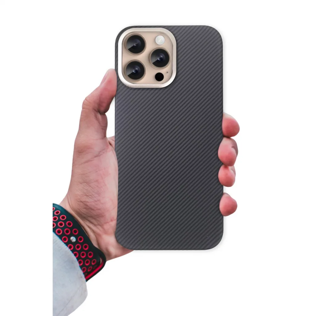 Sağlam, lüks ve hafif bir kılıftır sert plastik ve metal kamera çerçevesiyle tam koruma sağlar. Şık karbon fiber tasarımı modern bir görünüm sağlarken yerleşik MagSafe uyumluluğu da aksesuarların kolay şarj edilmesini ve bağlanmasını sağlar.