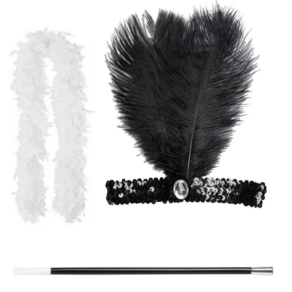 1920'ler Gatsby Kadın Aksesuar Seti &ndash Tüylü Saç Bandı, Uzun lık ve Beyaz Otriş