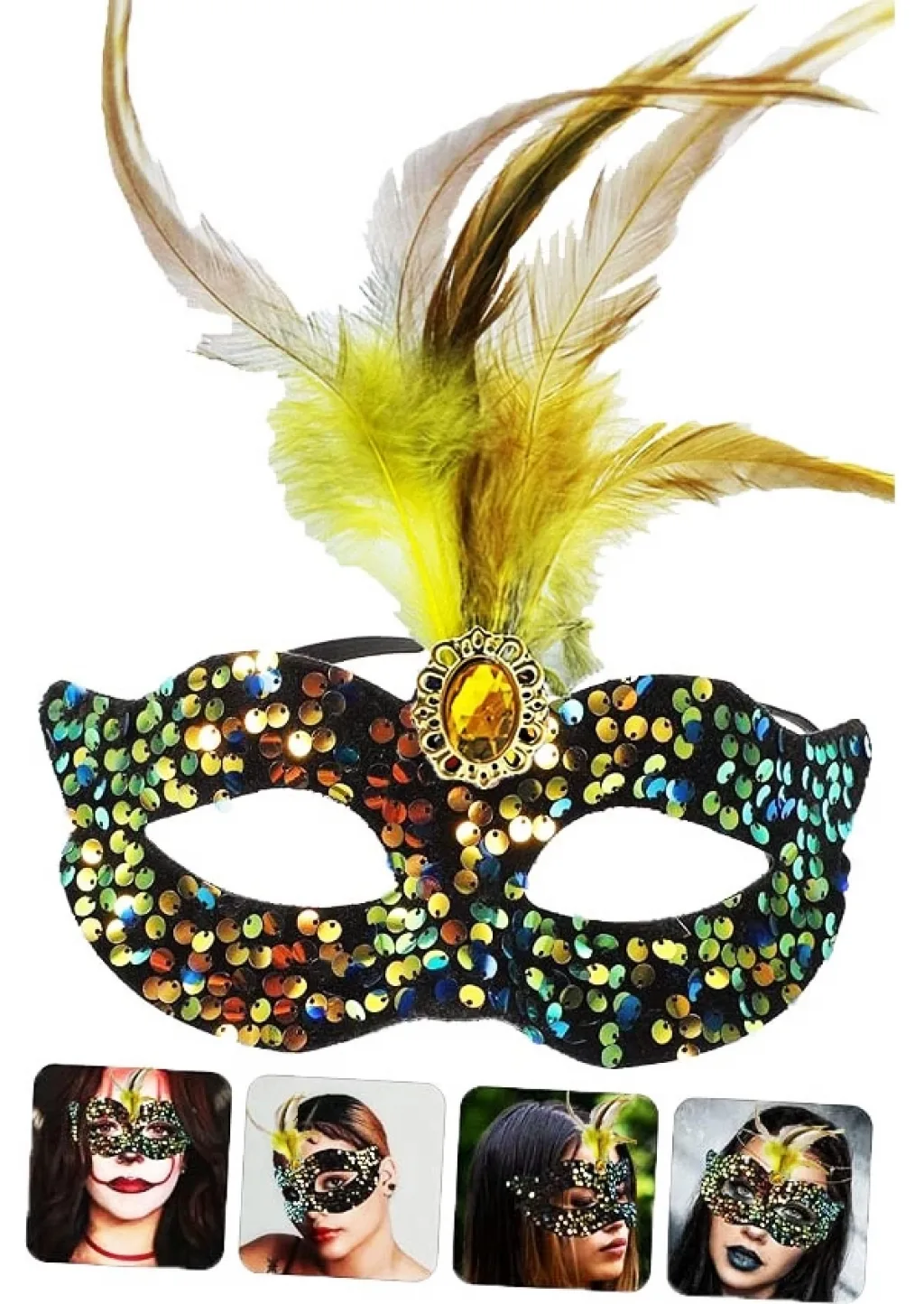 Karnavalda, baloda veya maskeli baloda göz kamaştırmak mı istiyorsunuz? Siyah Kadife Üzeri Rengarenk Payetli Pullu Sarı Tüylü Sarı Taşlı Parti Maskesi ile gecenin yıldızı siz olun