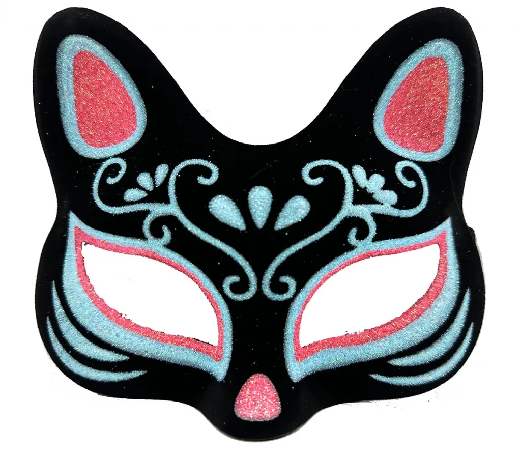 - Siyah süet kaplama ve mavi ve kırmızı simlerle süslenmiş, kedilerin sevimliliğini ve gizemini yansıtan bir maske tasarımı.