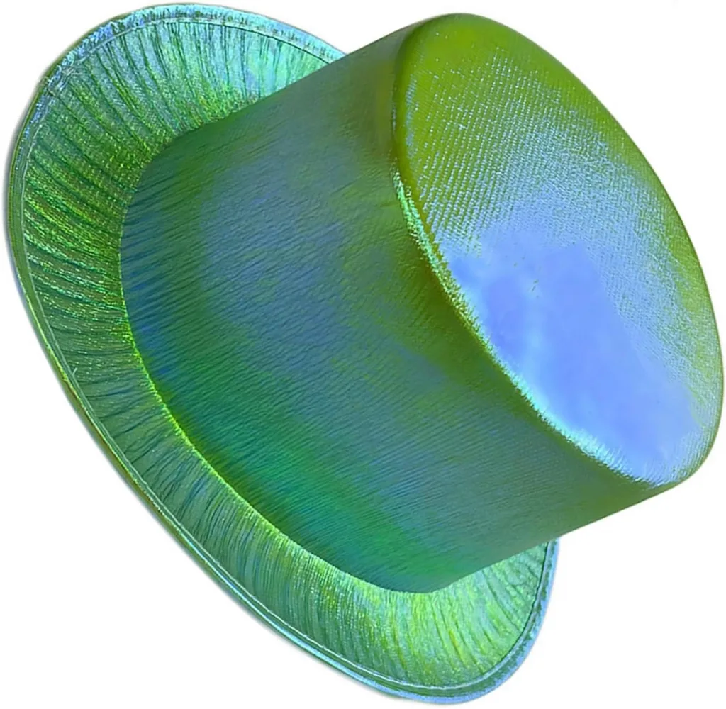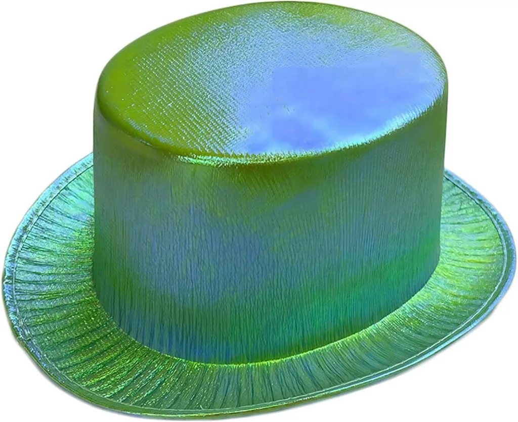 Yeşil Renk Işıltılı Hologram Kumaş Kaplama Fötr Silindir Şapka Yetişkin Boy, partiler, festivaller ve diğer özel günler için mükemmel bir aksesuardır. 58 cm baş çevresi için uygundur ve ışıl ışıl parıldayan yeşil hologram kumaşla kaplıdır.